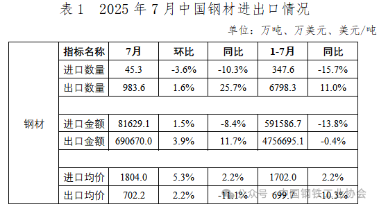 2025年7月,我國(guó)出口鋼材983.6萬(wàn)噸,較上月小幅回升1.6%,出口規(guī)模保持相對(duì)穩(wěn)定,出口均價(jià)702.2美元/噸,較上月小幅上漲2.2%。1-7月,我國(guó)累計(jì)出口鋼材6798.3萬(wàn)噸,同比增長(zhǎng)11.0%,出口均價(jià)699.7美元/噸,同比下跌10.3%。7月,我國(guó)進(jìn)口鋼材45.3萬(wàn)噸,環(huán)比下降3.6%,降幅較上月進(jìn)一步擴(kuò)大,進(jìn)口均價(jià)1804.0美元/噸,環(huán)比上漲5.3%。1-7月,我國(guó)累計(jì)進(jìn)口鋼材347.6萬(wàn)噸,同比下降15.7%,進(jìn)口均價(jià)1702.0美元/噸,同比上漲2.2%。