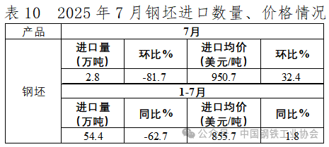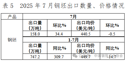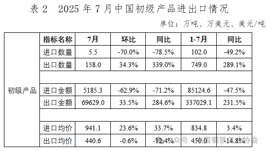 2025年7月,我國(guó)出口初級(jí)產(chǎn)品(鋼坯、生鐵、直接還原鐵及再生鋼鐵原料)158.0萬(wàn)噸,環(huán)比增長(zhǎng)34.3%;出口均價(jià)440.6美元/噸,環(huán)比基本持平。1-7月,我國(guó)累計(jì)出口初級(jí)產(chǎn)品749.0萬(wàn)噸,同比增長(zhǎng)2.9倍;出口均價(jià)450.0美元/噸,同比下跌14.8%,降幅較1-6月小幅收窄。7月,我國(guó)進(jìn)口初級(jí)產(chǎn)品5.5萬(wàn)噸,環(huán)比大幅下降70.0%;進(jìn)口均價(jià)941.1美元/噸,環(huán)比增長(zhǎng)23.6%。1-7月,我國(guó)累計(jì)進(jìn)口初級(jí)產(chǎn)品102.0萬(wàn)噸,同比下降49.2%;進(jìn)口均價(jià)834.8美元/噸,同比上漲3.4%。進(jìn)出相抵,1-7月我國(guó)折合粗鋼凈出口7384萬(wàn)噸,較上年同期增加1424萬(wàn)噸,同比增長(zhǎng)23.9%。