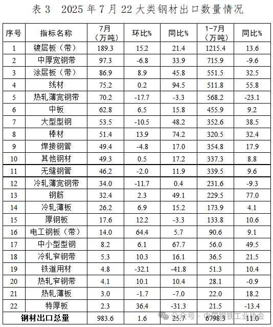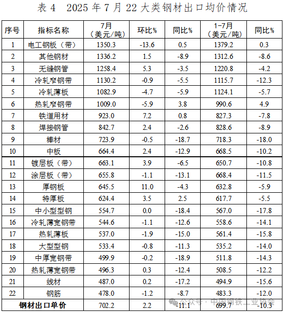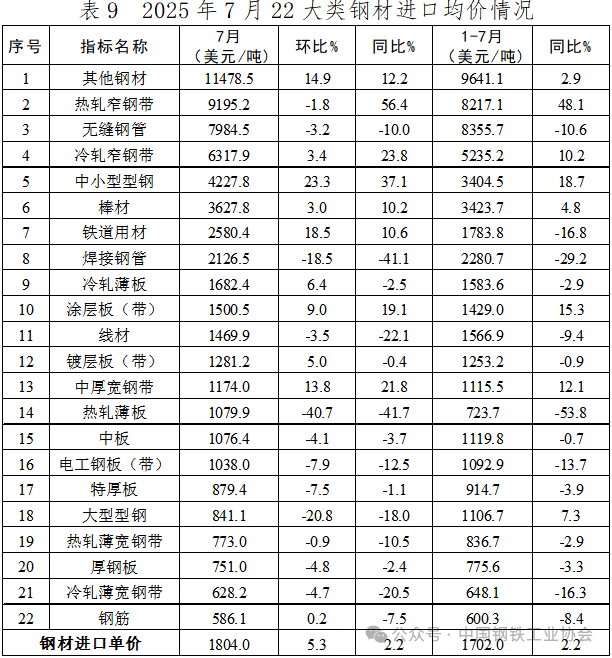 7月,22大類(lèi)鋼材品種中,有8類(lèi)品種出口量環(huán)比下降,減量主要來(lái)自熱軋板卷產(chǎn)品。其中,熱軋薄寬鋼帶、大型型鋼、冷軋薄寬鋼帶和鐵道用材等4個(gè)品種出口量環(huán)比降幅超過(guò)10%,中厚寬鋼帶、焊接鋼管、無(wú)縫鋼管及熱軋薄板等品種出口量環(huán)比也出現(xiàn)一定程度下降。其余14類(lèi)品種出口量環(huán)比出現(xiàn)增長(zhǎng),增量主要來(lái)自鍍層板(帶)、涂層板(帶)和棒材。1-7月,鍍層板(帶)是累計(jì)出口量最大的品種,占鋼材出口總量的17.9%;熱軋板卷產(chǎn)品累計(jì)出口量同比繼續(xù)呈下降態(tài)勢(shì),但中厚寬鋼帶和熱軋薄寬鋼帶兩個(gè)主要品種累計(jì)出口量同比降幅小幅收窄;線(xiàn)材和棒材累計(jì)出口量同比持續(xù)擴(kuò)大。7月,多數(shù)品種出口單價(jià)保持在較穩(wěn)定區(qū)間,電工鋼板(帶)出口單價(jià)環(huán)比跌幅最為明顯,為13.6%;厚鋼板出口單價(jià)環(huán)比漲幅最大,為11.0%。1-7月,電工鋼板(帶)和熱軋窄鋼帶2個(gè)品種出口單價(jià)同比已實(shí)現(xiàn)正增長(zhǎng),另有冷軋窄鋼帶等部分品種出口單價(jià)降幅同比收窄。