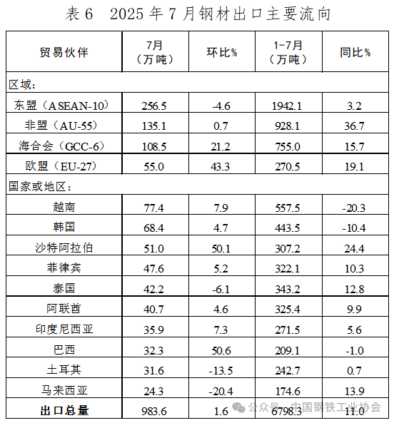 7月,我國(guó)對(duì)東盟出口鋼材規(guī)模持續(xù)下降,但降幅收窄;對(duì)海合會(huì)國(guó)家和歐盟出口規(guī)模環(huán)比明顯增長(zhǎng)。分國(guó)別來(lái)看,對(duì)越南、韓國(guó)及巴西的出口環(huán)比止跌回升,對(duì)其他拉丁美洲和東南亞主要國(guó)家的出口環(huán)比則出現(xiàn)不同程度下降。
