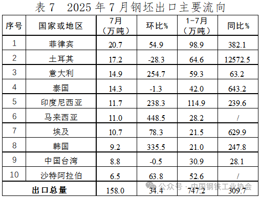 7月,我國(guó)鋼坯出口環(huán)比增長(zhǎng),向菲律賓、意大利、印度尼西亞、馬來(lái)西亞等國(guó)家出口環(huán)比持續(xù)大幅增長(zhǎng),向土耳其出口環(huán)比降幅近30%。