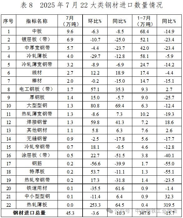 2025年7月,我國(guó)鋼材進(jìn)口規(guī)模持續(xù)萎縮,為近10年以來(lái)單月進(jìn)口量最低水平。各主要品種進(jìn)口量環(huán)比大多下降,進(jìn)口前5位的品種占當(dāng)月我國(guó)鋼材進(jìn)口總量的比重較上月有所下降。7月,我國(guó)鋼材的主要進(jìn)口來(lái)源及結(jié)構(gòu)仍保持穩(wěn)定,除自中國(guó)臺(tái)灣進(jìn)口鋼材環(huán)比回升外,自其它主要國(guó)家進(jìn)口鋼材數(shù)量環(huán)比均下降,且降幅大于總體水平。