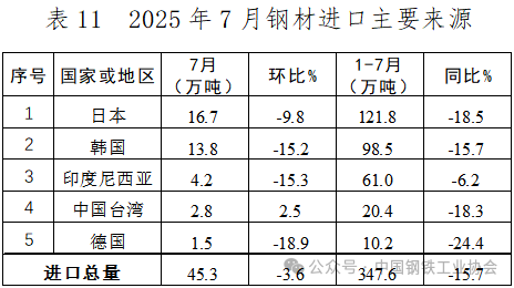 7月,我國(guó)鋼材進(jìn)口結(jié)構(gòu)總體保持穩(wěn)定,鋼材進(jìn)口規(guī)模雖持續(xù)減少,但環(huán)比降幅也在同步收窄。分國(guó)別來(lái)看,自日本、韓國(guó)、印度尼西亞和德國(guó)進(jìn)口的鋼材環(huán)比持續(xù)減少。