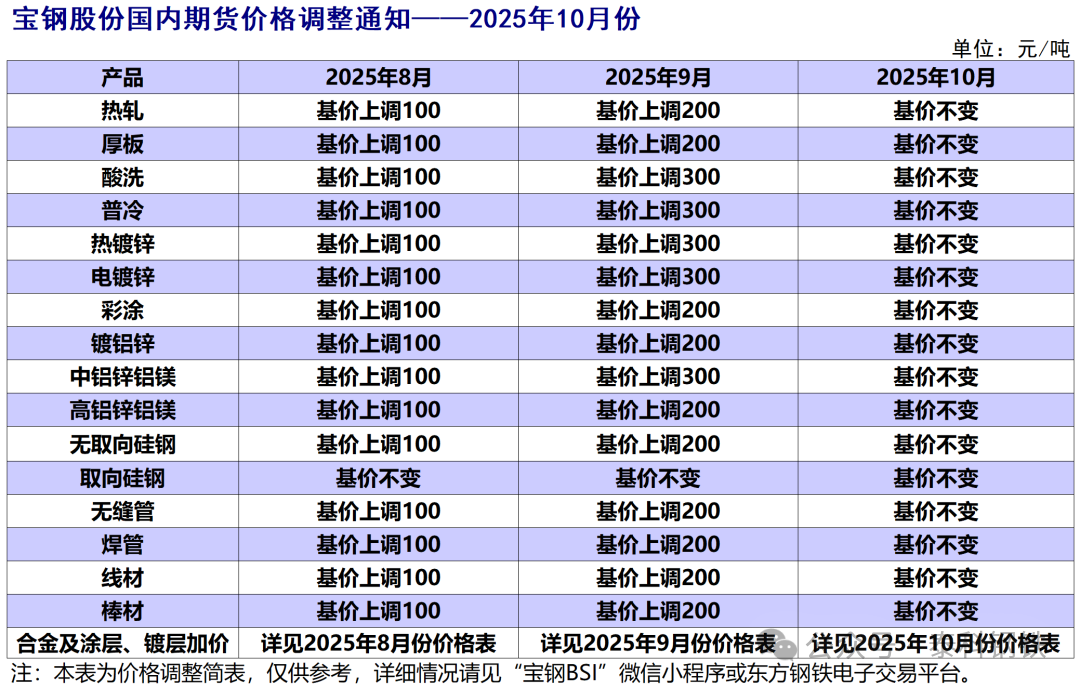 經(jīng)研究決定,寶鋼股份內(nèi)銷(xiāo)價(jià)格2025年10月份在9月份基礎(chǔ)上調(diào)整公告如下(以下除特殊注明外,均為不含稅):