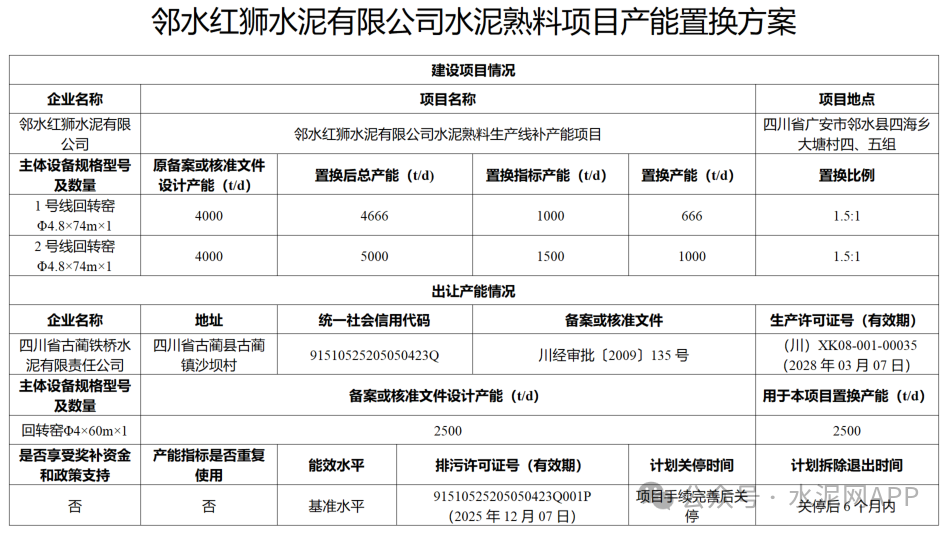 公示顯示,鄰水紅獅水泥1#4000t/d熟料線補(bǔ)充產(chǎn)能666t/d,補(bǔ)充后產(chǎn)能為4666t/d,2#4000t/d熟料線補(bǔ)充產(chǎn)能1000t/d,補(bǔ)充后產(chǎn)能為5000t/d,出讓產(chǎn)能來自四川省古藺鐵橋水泥有限責(zé)任公司一條2500t/d熟料線,置換比例1.5:1。