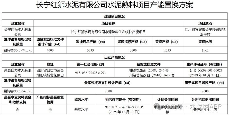 長(zhǎng)寧紅獅水泥4000t/d熟料生產(chǎn)線補(bǔ)充1333t/d產(chǎn)能,補(bǔ)充后產(chǎn)能為5333t/d,出讓產(chǎn)能來自榮縣自力水泥有限公司一條2000t/d熟料線,置換比例1.5:1。