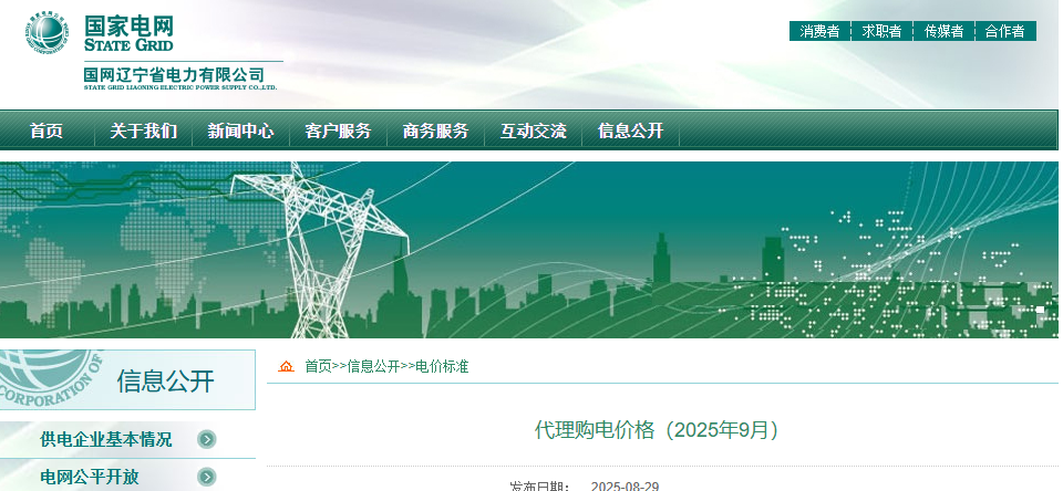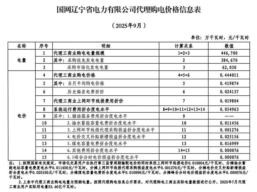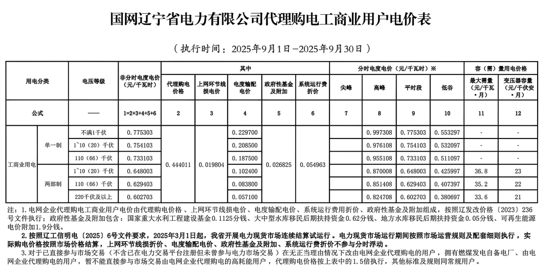 國網(wǎng)遼寧省電力有限公司代理購電工商業(yè)用戶電價表(2025年9月)