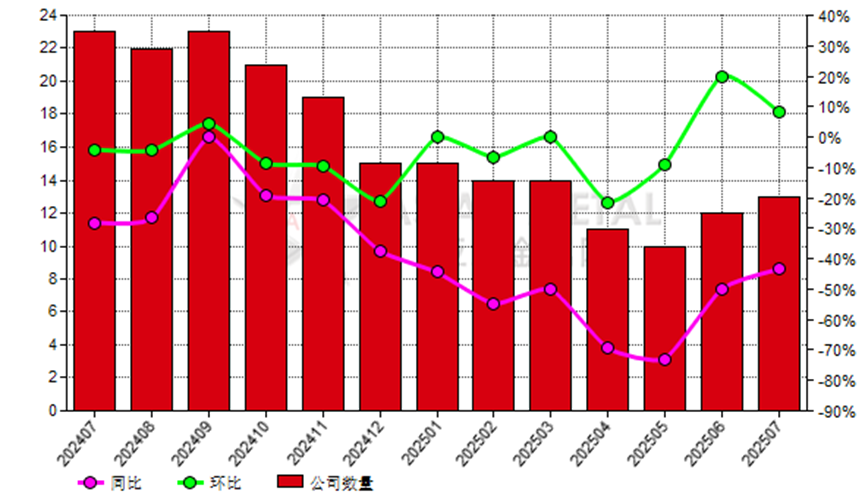 2025年1-7月,13家生產(chǎn)商共計(jì)生產(chǎn)125,300.00公噸,平均開工率5.47%。
