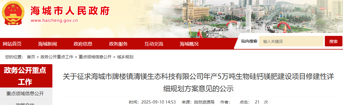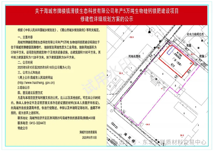 為切實增強規(guī)劃的科學(xué)性、合理性和可行性,征求公眾意見,根據(jù)《中華人民共和國城鄉(xiāng)規(guī)劃法》第二十六條規(guī)定,現(xiàn)將海城市牌樓鎮(zhèn)清鎂生態(tài)科技有限公司年產(chǎn)5萬噸生物硅鈣鎂肥建設(shè)項目修建性詳細規(guī)劃方案內(nèi)容公告如下: