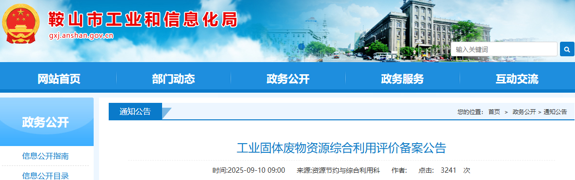 按照工信部《工業(yè)固體廢物資源綜合利用評(píng)價(jià)管理暫行辦法》、《國(guó)家工業(yè)固體廢物資源綜合利用產(chǎn)品目錄》、省工信廳《遼寧省工業(yè)和信息化廳關(guān)于做好工業(yè)固體廢物資源綜合利用評(píng)價(jià)工作的通知》(遼工信資源〔2023〕129號(hào))及《鞍山市工業(yè)固體廢物資源綜合利用評(píng)價(jià)管理實(shí)施辦法》要求,2025年9月3日-2025年9月9日,我局對(duì)鞍山廈美環(huán)??萍加邢薰?、鞍山昊通新材料有限公司、鞍鋼綠色資源科技有限公司工業(yè)固體廢物綜合利用評(píng)價(jià)進(jìn)行備案公示。截至公示期結(jié)束,未收到不同意見(jiàn),現(xiàn)予以公布。