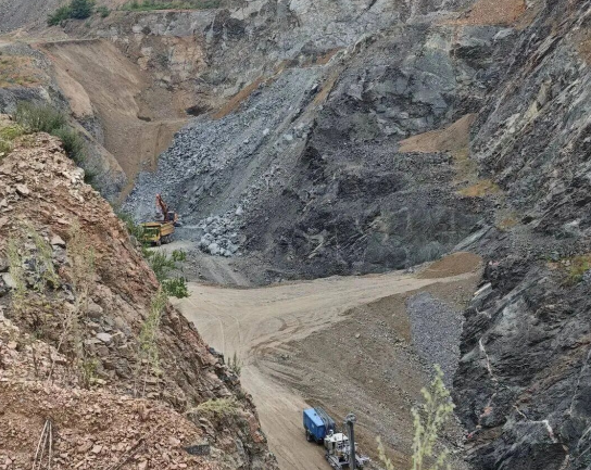 結(jié)束第一處現(xiàn)場(chǎng)處置下山途中,帶隊(duì)負(fù)責(zé)人又觀察到對(duì)面山上有可疑的大型車輛通行痕跡,在沿一條岔路上山途中,發(fā)現(xiàn)路上水泥地殘留的黑色大型輪胎印,立即帶領(lǐng)監(jiān)察員循跡追蹤。步行至山頂發(fā)現(xiàn),一個(gè)廢石傾倒場(chǎng)地赫然出現(xiàn),鏟車和運(yùn)礦車正在邊坡傾倒廢石。監(jiān)察人員跟隨這輛運(yùn)礦車,最終發(fā)現(xiàn)一個(gè)作業(yè)條件極其危險(xiǎn)的深坑開采點(diǎn),坑內(nèi)有挖掘機(jī)、運(yùn)礦車正在裝車作業(yè),附近還停放一臺(tái)專業(yè)鑿巖臺(tái)車。