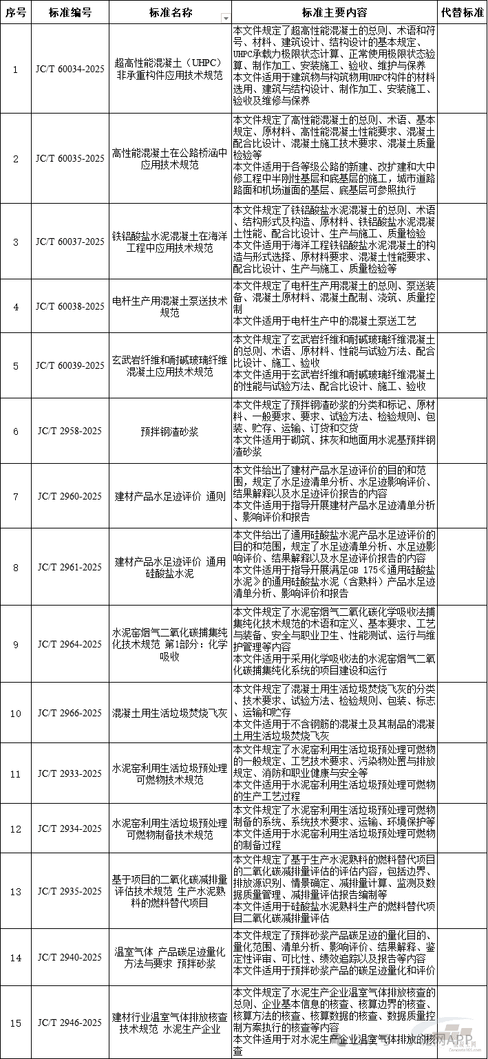117項(xiàng)行業(yè)標(biāo)準(zhǔn)名稱及主要內(nèi)容等一覽表(水泥、混凝土、砂漿):