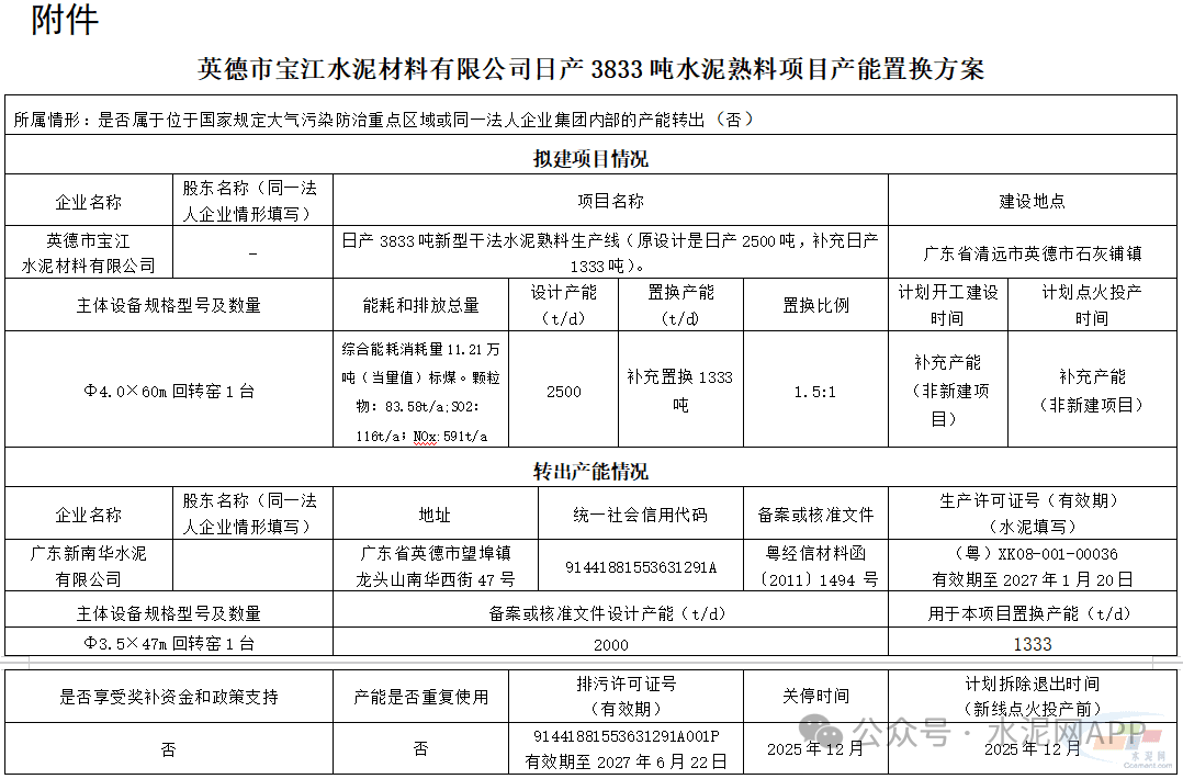 置換方案顯示,英德市寶江水泥2500t/d熟料線補(bǔ)充產(chǎn)能1333t/d,補(bǔ)充后產(chǎn)能為3833t/d,退出產(chǎn)能來自廣東新南華水泥有限公司一條2000t/d熟料生產(chǎn)線,置換比例1.5:1。