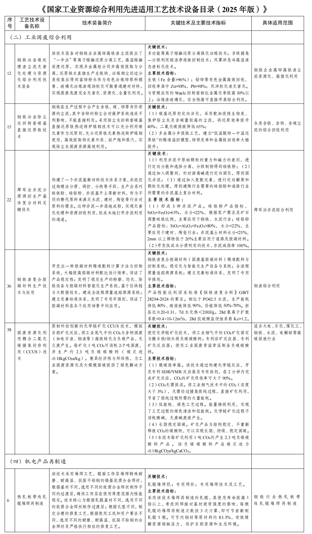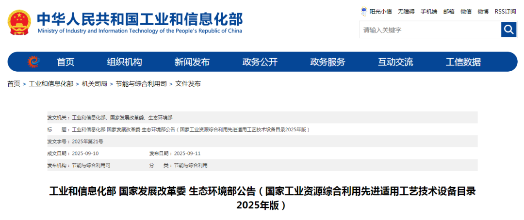 9月11日,為加快推動(dòng)工業(yè)固廢源頭減量和規(guī)模化利用,提升再生資源綜合利用水平,發(fā)展高端智能再制造,工業(yè)和信息化部、國(guó)家發(fā)展改革委、生態(tài)環(huán)境部編制了《國(guó)家工業(yè)資源綜合利用先進(jìn)適用工藝技術(shù)設(shè)備目錄(2025年版)》,于工信部官網(wǎng)進(jìn)行了公示。