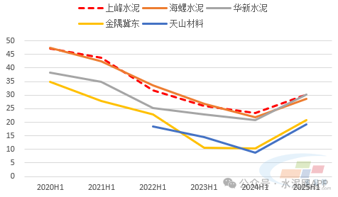 盡管水泥熟料綜合銷量出現(xiàn)下降,但得益于煤炭采購價格下跌和精細化管理促使可控成本下降,2025年上半年公司水泥熟料綜合毛利率達到30.1%,較去年同期提升6.7個百分點,絕對毛利率水平略微低于華新水泥(主要海外帶動),超過國內(nèi)多數(shù)主要上市公司,在行業(yè)中處于領(lǐng)先地位,水泥產(chǎn)品盈利能力較強。