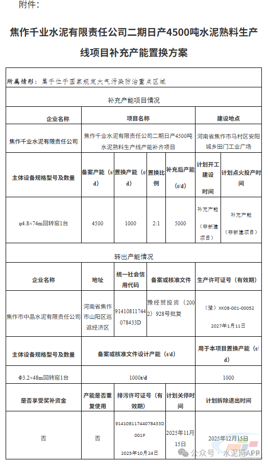近日,河南省焦作市馬村區(qū)人民政府網(wǎng)站發(fā)布了關(guān)于焦作千業(yè)水泥有限責(zé)任公司二期日產(chǎn)4500噸水泥熟料生產(chǎn)線項目補充產(chǎn)能置換方案的公示。公示期:2025年9月17日至2025年9月23日(5個工作日)。