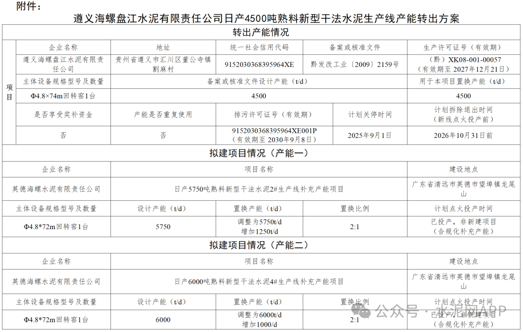 9月19日,貴州省工信廳發(fā)布“關于遵義海螺盤江水泥有限責任公司2#日產(chǎn)4500噸熟料新型干法水泥生產(chǎn)線產(chǎn)能轉(zhuǎn)出方案的公示”。
