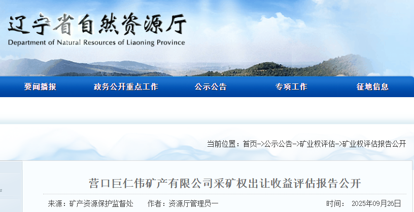 按照《關于完善礦業(yè)權(quán)出讓收益評估程序的通知》(遼自然資辦發(fā)[2022]2號)要求,《營口巨仁偉礦產(chǎn)有限公司采礦權(quán)出讓收益評估報告》及相關附件已在省自然資源廳公示10個工作日,無異議,予以公開。