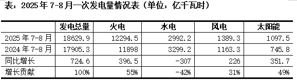 ★新能源替代效應(yīng)大為增強(qiáng)七、八月份,與火電裝機(jī)容量基本相當(dāng)?shù)男履茉闯隽φ?dāng)時(shí),風(fēng)電、太陽(yáng)能發(fā)電等新能源裝機(jī)的新增發(fā)電量不僅彌補(bǔ)了水電下降帶來(lái)的供應(yīng)缺口,還在很大程度上滿足了全社會(huì)用電量增長(zhǎng)的需求(同比增長(zhǎng)3.7%)。這從國(guó)家統(tǒng)計(jì)局發(fā)布的一次發(fā)電量情況表中可以清楚的看出來(lái)。