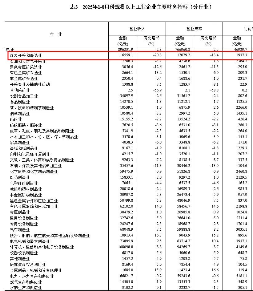 1—8月份,煤炭開(kāi)采和洗選業(yè)利潤(rùn)總額1937.3億元,同比下降53.6%。