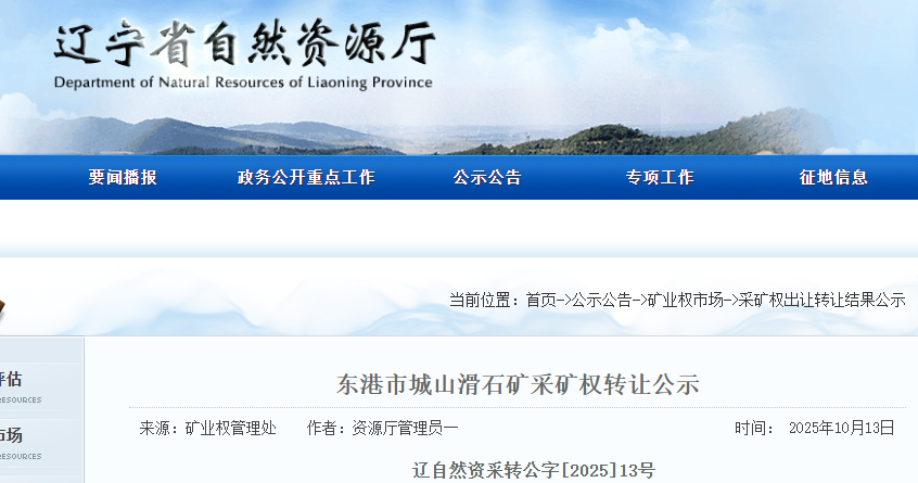 根據(jù)《探礦權(quán)采礦權(quán)轉(zhuǎn)讓管理辦法》(國務(wù)院令242號)、《自然資源部關(guān)于印發(fā)礦業(yè)權(quán)出讓交易規(guī)則的通知》(自然資規(guī)〔2023〕1號)等相關(guān)規(guī)定,現(xiàn)將東港市城山滑石礦采礦權(quán)轉(zhuǎn)讓信息公示如下: