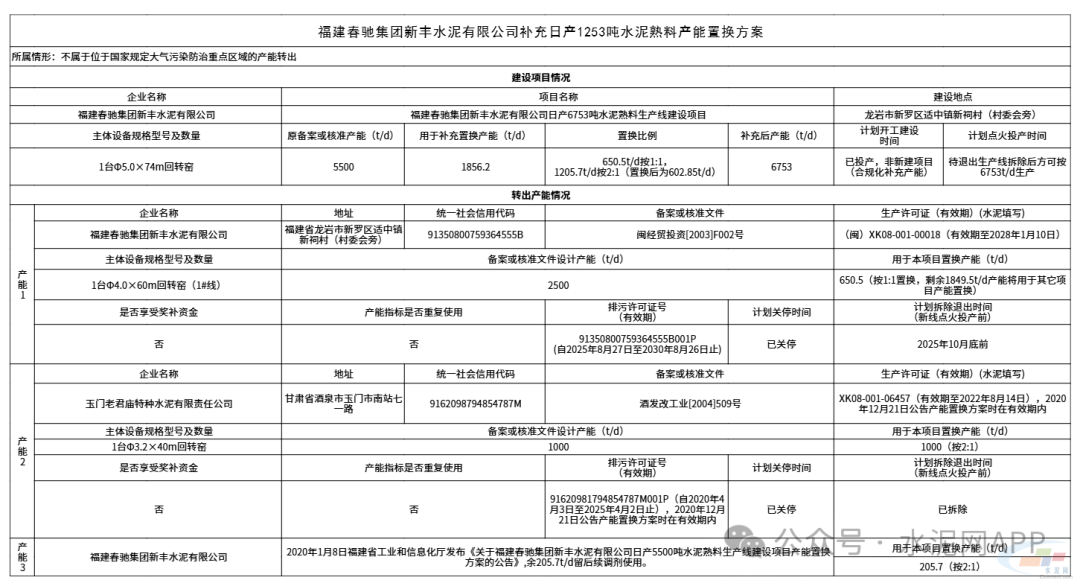變更后為福建春馳新豐水泥一條5500t/d熟料生產(chǎn)線補(bǔ)充產(chǎn)能1856.2t/d,補(bǔ)充后產(chǎn)能為6753t/d,退出產(chǎn)能來自該企業(yè)一條2500t/d及玉門老君廟特種水泥一條1000t/d熟料生產(chǎn)線。