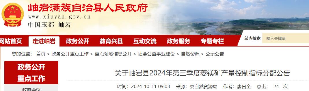 根據(jù)鞍山市菱鎂行業(yè)專項(xiàng)整治工作推進(jìn)組辦公室《關(guān)于鞍山市2024年第三季度菱鎂礦產(chǎn)量控制指標(biāo)預(yù)分配的通知》(鞍鎂辦〔2024〕1號(hào)),現(xiàn)對(duì)岫巖縣2024年第三季度菱鎂礦產(chǎn)量控制指標(biāo)分配情況予以公告。
